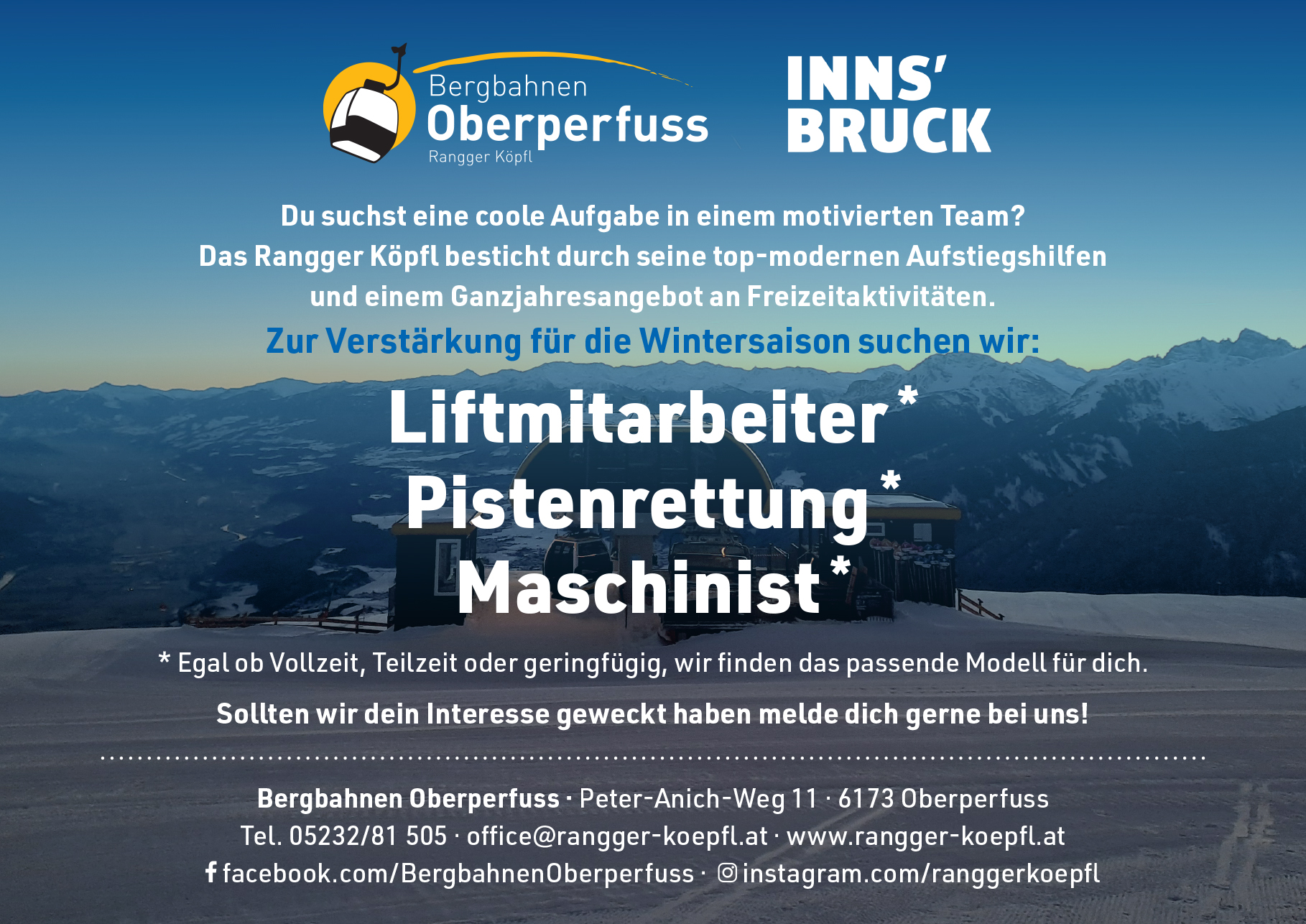 Du suchst eine coole Aufgabe in einem motivierten Team? Das Rangger Köpfl besticht durch seine top-modernen Aufstiegshilfen und einem Ganzjahresangebot an Freizeitaktivitäten.